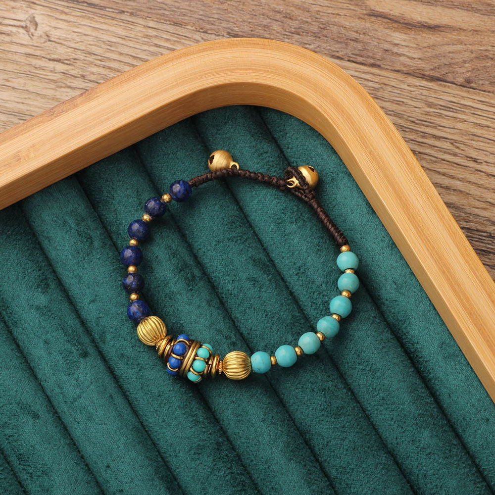 Această Brățară Tibetană în stil etnic Nepal este o piesă artizanală unică, realizată manual, inspirată de tradițiile spirituale ale Himalayei. Designul său combină mărgele naturale în nuanțe profunde de albastru și turcoaz, completate de elemente metalice aurii și un fir împletit tradițional.