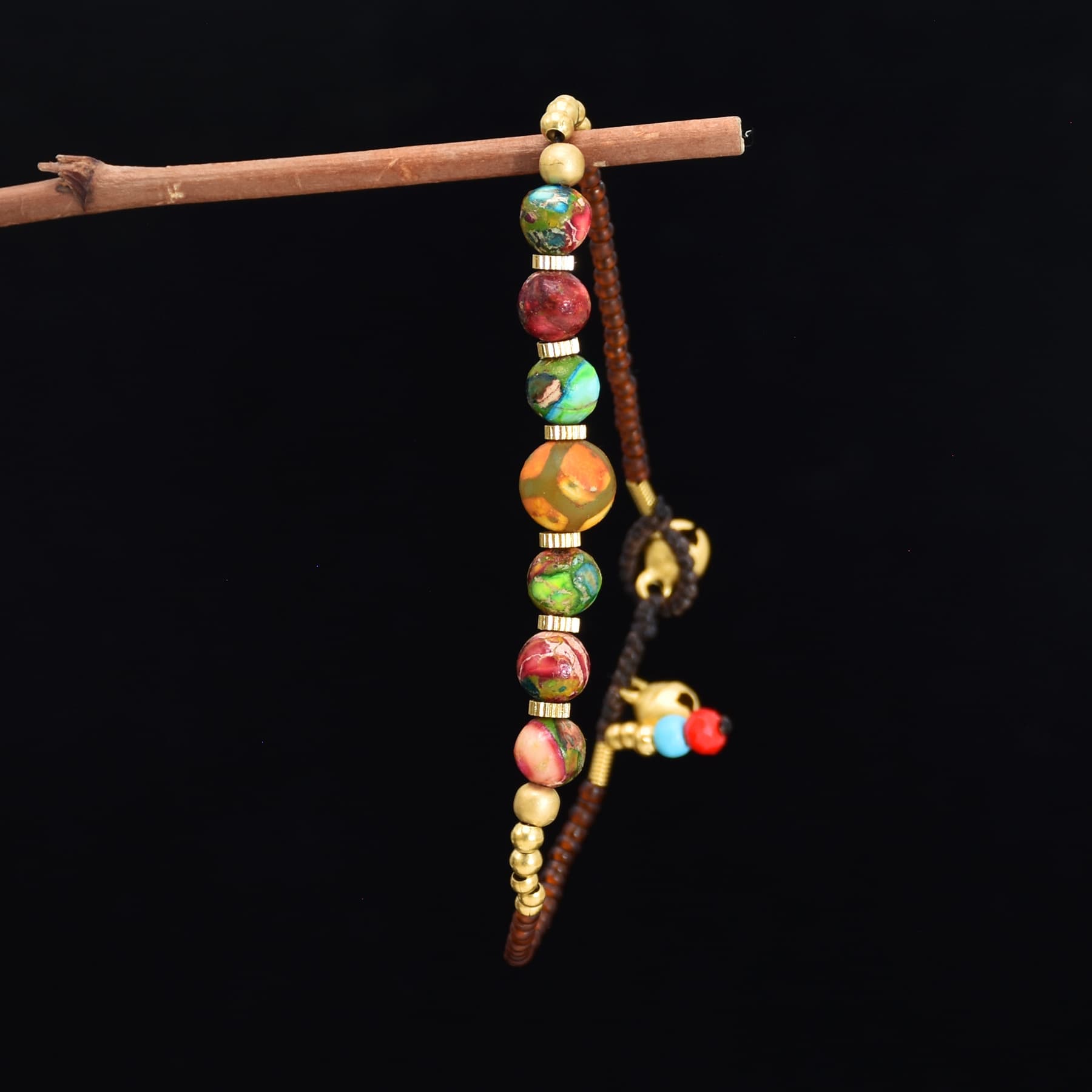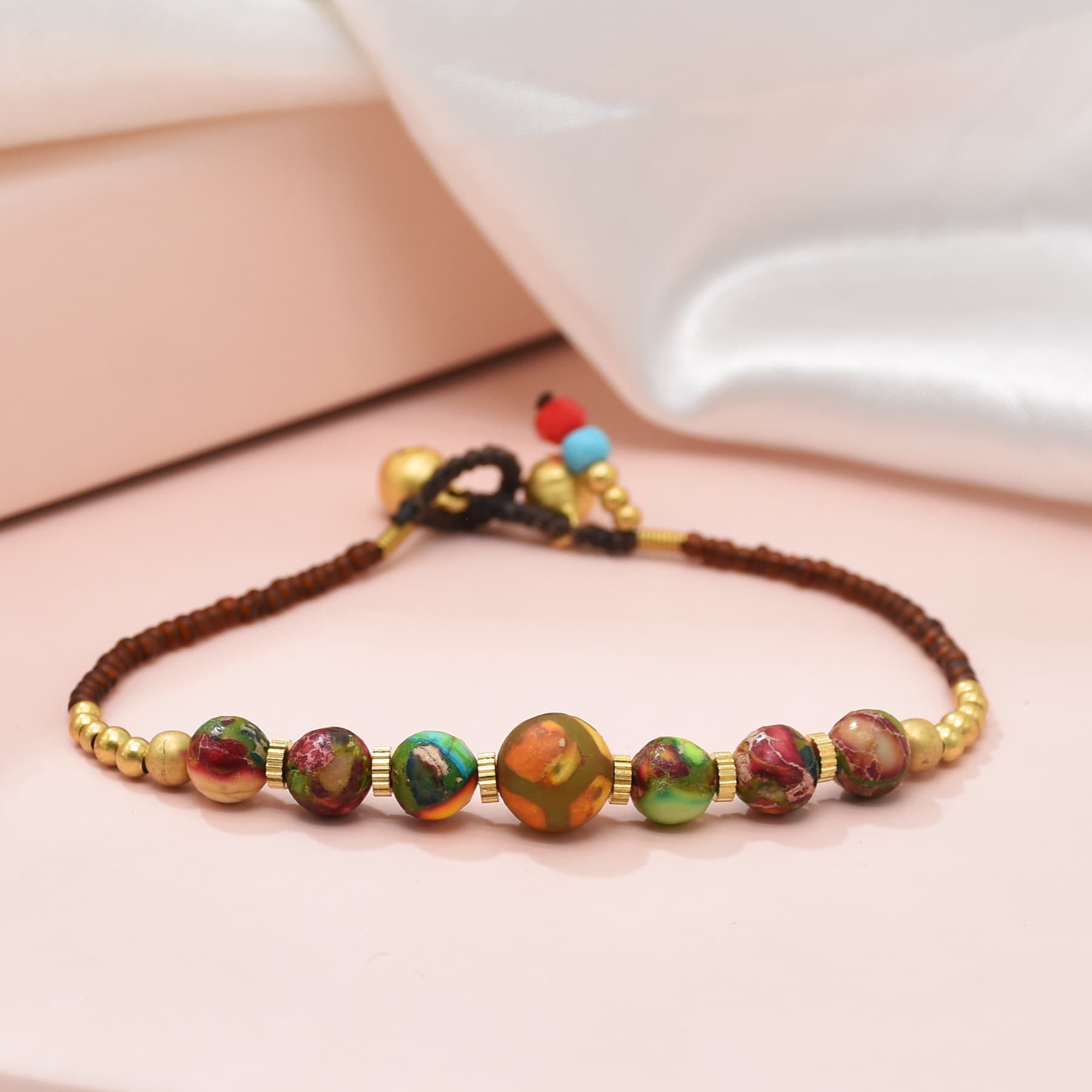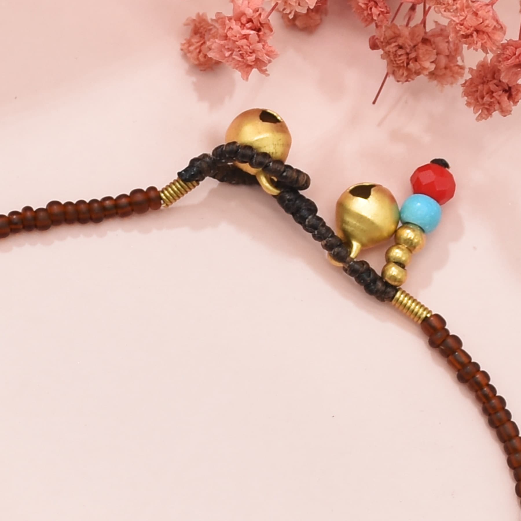 Firul subțire maroniu și mărgelele aurii adaugă eleganță, iar sistemul de închidere cu clopoței tibetani aurii oferă un aer autentic, specific culturilor nepaleze. Cele două mărgele decorative de la capăt, în tonuri de turcoaz și roșu, completează piesa cu o notă boho și jucăușă.