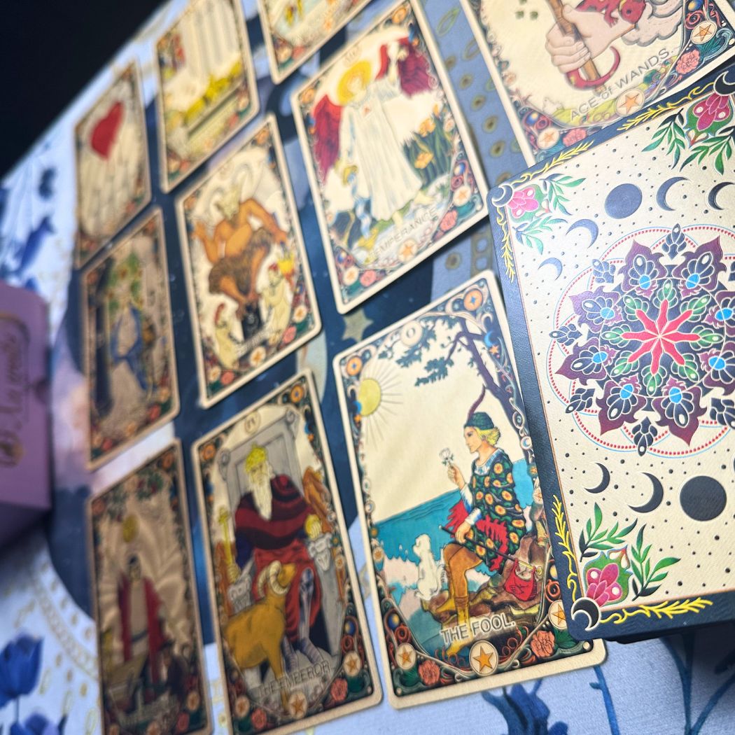KU Weite este pachetul pentru momentele în care vrei tarot care se simte blând, frumos și clar. Are o estetică florală rafinată, cu simboluri lunare pe spatele cărților, iar stilul ilustrațiilor păstrează structura clasică a tarotului — ceea ce îl face ușor de interpretat, chiar și dacă ești la început.